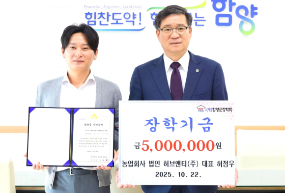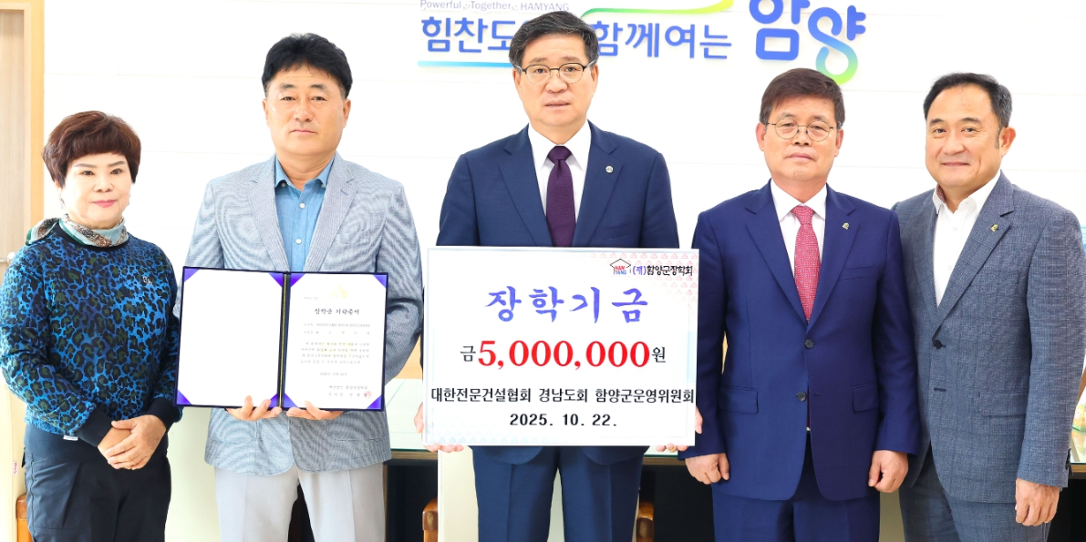 함양군, 찬바람 속 지역 인재를 위한 따뜻한 나눔 이어져대한전문건설협회 경남도회 함양군운영위원회 500만 원,농업회사법인 허브앤티(주) 허정우 대표 500만 원 기탁 이광훈 기자 / |