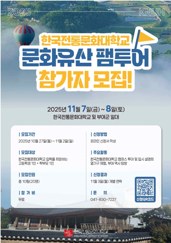 예비 전통문화 인재들과 한국전통문화대학교(부여) 탐방- 고등학생·학부모 대상 입시 설명 · 문화유산 체험 프로그램 운영(11.7.~8.) / 참가자 모집(~11.2.)이광훈 기자 / |