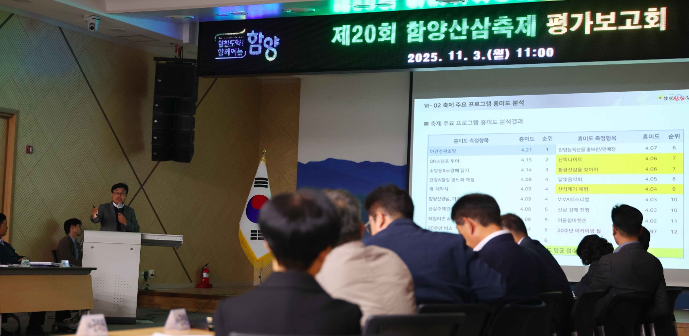 함양군은 11월 3일 군청 대회의실에서 진병영 군수를 비롯한 이현재 산삼축제위원장, 축제 위원, 군의원, 부서장 등 70여 명이 참석한 가운데 ‘2025년 제20회 함양산삼축제 평가보고회’를 개최했다.