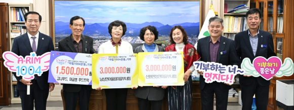 이번 기탁에는 남상면 어울림마을 부녀회(회장 김경희)와 신원면 청연마을 부녀회(회장 우훈자)가 각각 300만 원을 아림1004운동에 전달했으며, 푸드트럭 운영업체 고니푸드(대표 노태곤)와 머글랭(대표 유정은)도 각각 100만 원, 50만 원을 기탁했다.