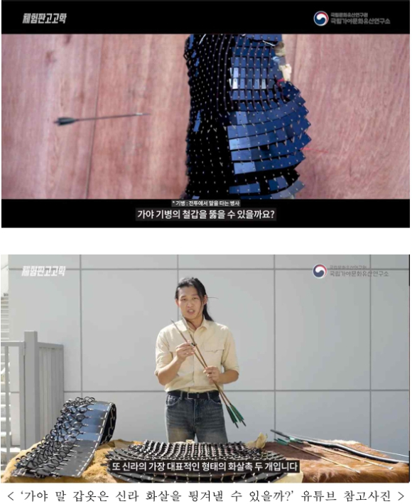 | 또한 신갑은 관통되었지만, 여러 개의 철판을 이어 붙인 찰갑(札甲)의 구조적 특성으로 인해 2~4겹이 겹쳐진 부분에서는 말의 몸체까지 손상이 전달되지 않았다. 가죽 부분이 끊어지더라도 갑옷 전체가 쉽게 파손되지 않으며, 추후 보수도 가능한 수준임을 확인하였다. 이는 가야 갑옷이 단순한 철판 보호구가 아니라, 겹겹의 방어층을 형성하여 실전에서 충분한 방어 기능을 발휘했음을 보여준다. * 찰갑(札甲): 여러 장의 작은 철판을 가죽 줄로 이어 붙여 만든 갑옷 이번 실험의 결과는 가야의 철기 제작 기술과 병기 운용 방식을 과학적으로 규명하는 중요한 단서를 제공하였다. 특히, 고대 가야가 단순히 갑옷을 제작하는 수준을 넘어 탄소 함량 조절을 통해 방어 성능을 강화했다는 사실이 실험적으로 입증되면서, 당시 금속 가공 기술이 상당히 발전된 수준이었음을 보여준다.