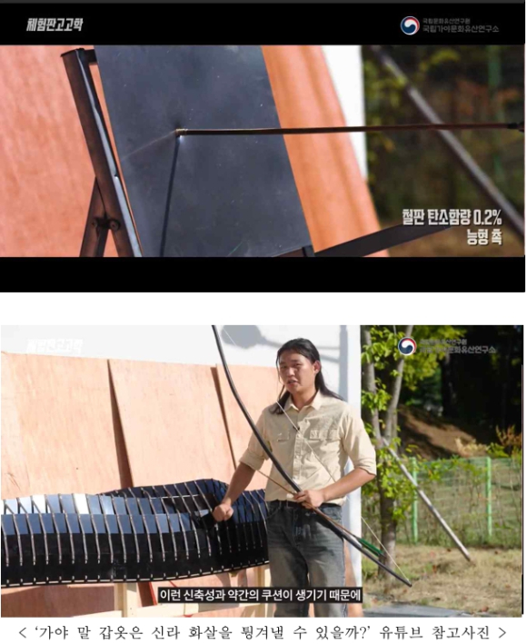 | 이번 타격 실험은 각 갑옷 재현품에 쇠 화살을 타격하여 탄소 함량과 실제 방어 성능의 연관성을 확인하는 방식으로 진행되었다. * 기마 병기: 말과 함께 사용하는 무기 및 방어구 일체. 말 갑옷 등의 보호 장비를 포함함. * 신갑: 말의 몸통(옆구리와 배 부분)을 보호하기 위한 갑옷으로, 네모꼴 형태의 철판을 이어 붙여 제작 * 경흉갑: 말의 목(경갑)과 가슴(흉갑)을 보호하는 갑옷으로, 사다리꼴 형태의 철판을 이어 붙여 제작 실험 결과, 탄소 함량 0.2%로 제작된 신갑은 충격에 취약해 화살 타격에 의해 쉽게 관통되었으나, 상대적으로 높은 0.8%의 탄소 함량으로 제작된 경·흉갑은 강도와 경도가 확보되어 관통되지 않고 충격을 효과적으로 흡수하여 방어에 성공하였다.