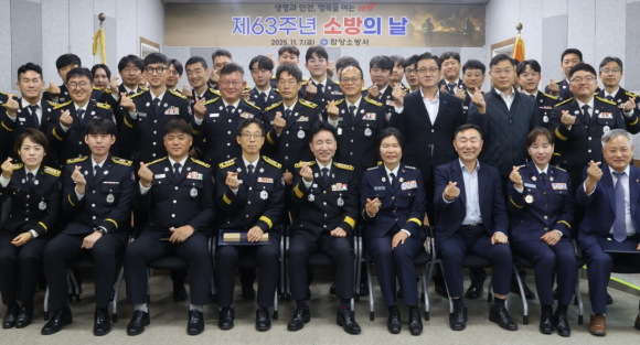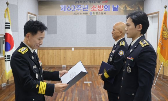 함양소방서, 제63주년 ‘소방의 날’ 기념행사 개최대통령 표창 소방령 이동철, 행정안전부 장관 표창 소방위 조래홍 등 총 14명과 1개 부서가 수상한용택 기자 / |