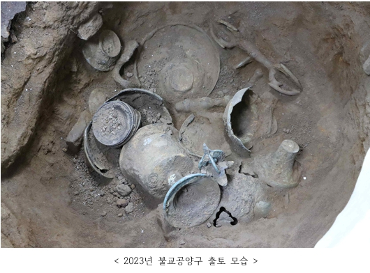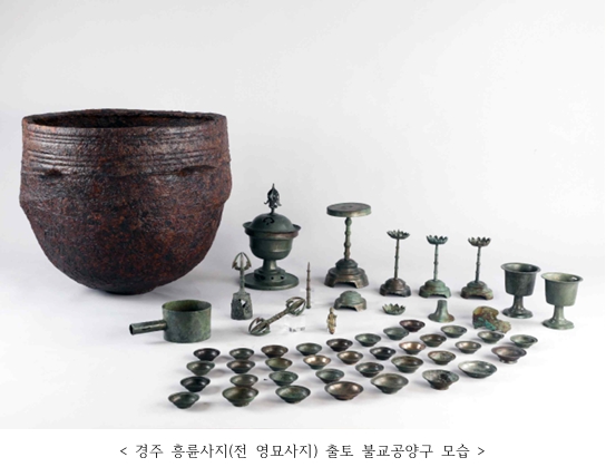 참고로, 경주 흥륜사지(전 영묘사지) 출토 불교공양구는 2023년 경주시 사정동 292-1번지 하수관로 설치를 위한 발굴조사 중 철솥 안에서 확인된 고려시대 유물 58점이다. 국내 처음 발굴된 사례로, 화려한 조형미와 정교한 제작기법이 주목되는 ‘연화형 촛대받침’과, 고려시대 경주지역에서 수행된 밀교의식의 존재를 짐작케 하는 ‘금강저·금강령’을 비롯해 청동향로, 청동향완, 청동광명대, 청동촛대 등이 함께 발굴되어, 고려 불교의 예술적 수준과 의례문화의 다양성을 보여주는 중요한 자료로 평가된다.