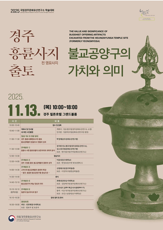 국가유산청 국립문화유산연구원 국립경주문화유산연구소(소장 임승경, 이하 ‘경주연구소’)는 오는 11월 13일(목) 오전 10시 경주 힐튼호텔 그랜드볼룸에서 「경주 흥륜사지(전 영묘사지) 출토 불교공양구의 가치와 의미」 학술대회를 개최한다.