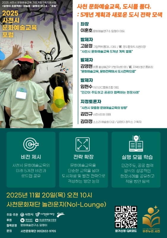 사천시 문화예술교육, 도시 미래 전략으로 도약한다!- 사천시 문화예술교육 기초거점구축「담쟁이 프로젝트」포럼 개최 -- 사천시 문화예술교육 5개년 비전 공개 및 민관 협력 거점 모델 모색- 이광훈 기자 / |