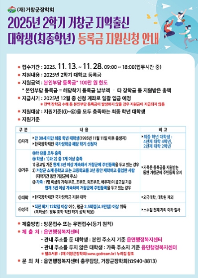 2025년 2학기 거창군 지역출신 대학생 등록금 지원1학기에 이어 2학기에도 본인 부담 등록금의 최대 100만 원 지원2026년부터는 최종 학년 직전 학년까지 확대 시행 정유근 기자 / |