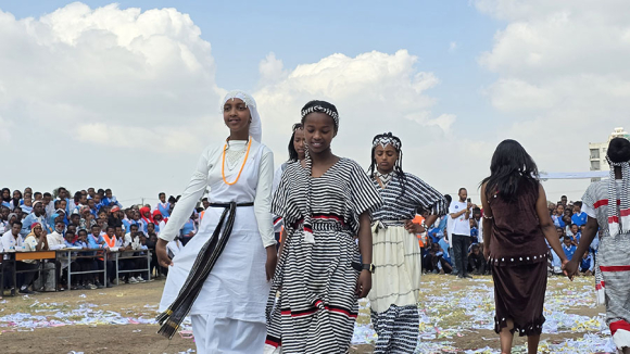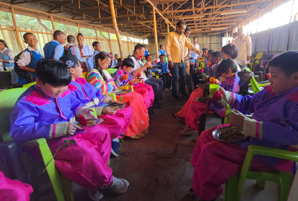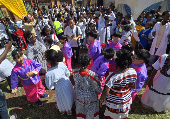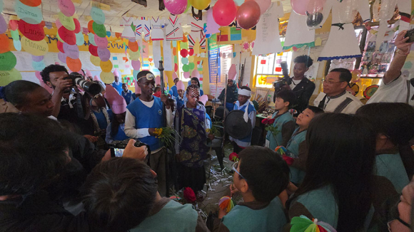 | 이어 현지 학교에서는 우리 방문단을 대상으로 학교시설 견학, 인젤라 급식체험, 마을 족장의 축복, 학생들이 환영인사, 전통의상 퍼레이드, 전통춤 공연, 선물 증정, 단체사진 촬영, K-POP 공연과 애국가 연주, 편지 전달 등 문화와 우정을 나누는 소중한 경험을 선사했고, 우리 방문단에서도 방문의 목적을 들려주고 준비해간 우리 전통 부채춤 공연과 학교와 학생들에게 선물을 전달할 뿐 아니라 현지 친구들과의 소통을 통하여 진한 우정을 나누며 큰 환영에 답했다.