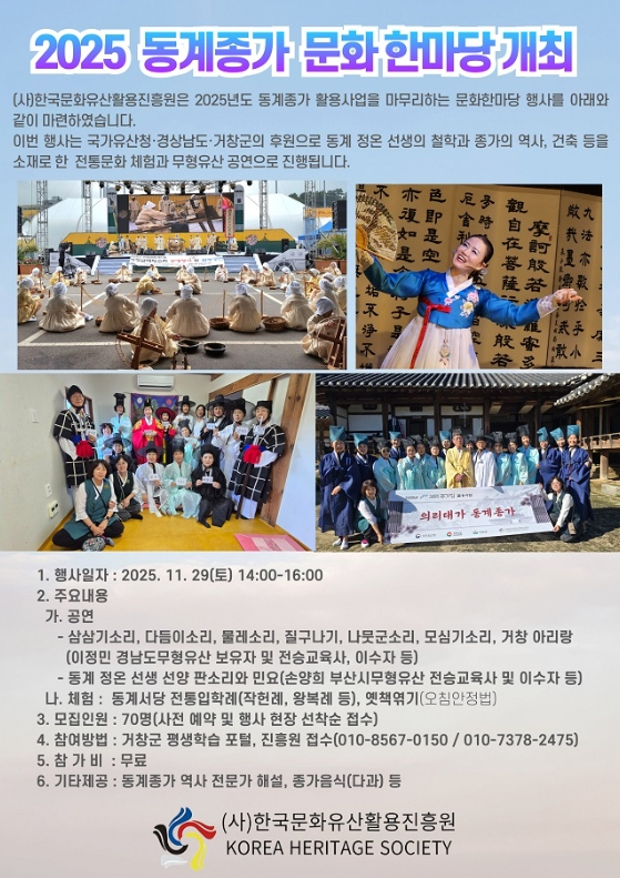 | 무형유산 공연은 경상남도무형유산보유자 이정민과 전승자들이 거창지역에 전승되는 삼삼기, 물레소리, 질구나기, 나무꾼소리, 모심기소리 등 노동요 및 거창아리랑 공연 펼친다. 또한 동계 정온 선생의 의리정신을 선양하는 공연으로 부산시무형유산전승교육사 손양희 등 전승자들이 동계 선생의 삶과 철학 등을 사설로 풀어낸 판소리와 민요로 의미를 더하게 된다. 한편 무형유산 공연 후에는 동계 종가의 역사에 대한 전문해설, 동계 선생 사당 참배, 동계서당 입학례(작헌례, 왕복례, 수폐례, 입학례), 옛책엮기인 오침안정법 등 문화체험도 진행된다. 동계종택에서 처음으로 개최하는 무형유산 공연은 유형유산인 동계종가의 건축적인 아름다움과 어우러져 지역민들의 문화향유권 증진에도 기여할 것이다.