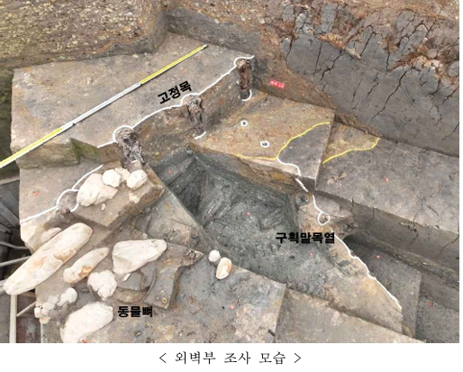 | 또한, 성벽 외부에서는 말뼈와 땅의 경계를 구분하기 위해 일정한 간격으로 말뚝(말목)들을 박아 놓은 구획말목열이 확인되었다. 성벽 내부에서는 고정목과 협판이 발견되었는데, 가속질량분석기(AMS)를 사용한 연대측정 결과가 각각 460~548년, 480~540년으로 확인되어 초축 이후 6세기 초 대대적인 성벽의 수·개축이 있었음을 추정할 수 있다. 이와 같은 복합적인 성벽구조와 다양한 부속시설들로 미루어 보아 「함안 가야리 유적」은 아라가야의 최전성기에 축조된 왕성으로 평가된다. * 가속질량분석기(AMS; accelerator mass spectrometer) : 뼈, 목재, 섬유류 등 방사성탄소를 포함한 유기물의 연대를 측정하는 방법인 방사성탄소연대측정에 사용되는 장비