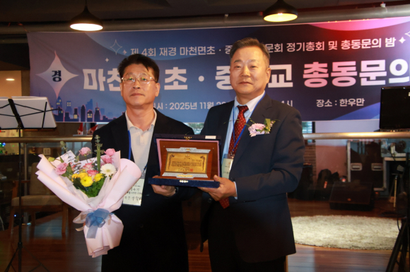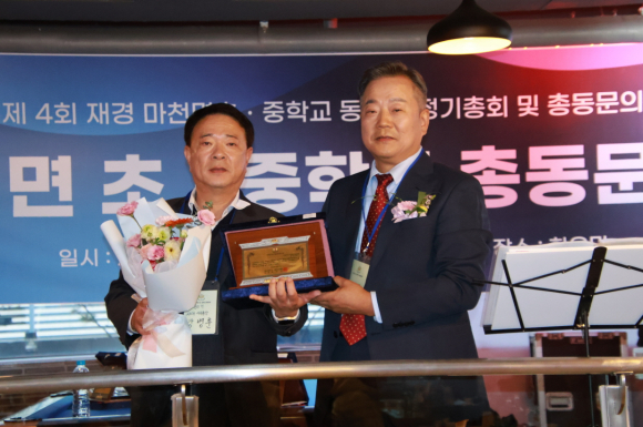 재경 동문인 상 수여, 꽃다발 전달과 기념사진 촬영이 있었다.