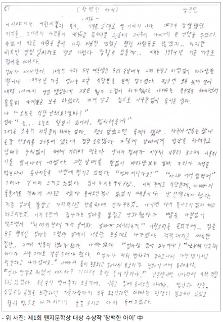 양훈도 심사위원은 “대상 수상작 강진민씨의 산문 ‘창백한 아이’는 심사위원 전원이 단숨에 만장일치로 선정했을 만큼 탁월하다”며 “10살 무렵 학대의 경험을 절절하게 다시 들여다보고, 아버지를 용서하는 결말이 이보다 더 핍진할 수 없겠다 싶은 글이었다”며 심사 소감을 피력했다.