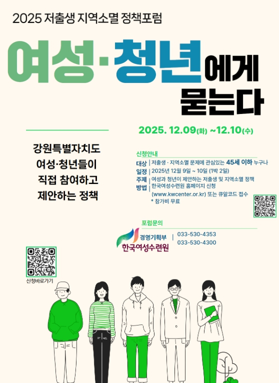 (재)한국여성수련원, 저출생 및 지역소멸 극복 「여성·청년에게 묻는다」 포럼 개최- 여성과 청년이 직접 해법을 제시하는 강원형 참여 기반 정책 공론장 열려-▶ 여성·청년 당사자가 참여하는 정책 논의 장 마련 ▶ 강원 인구감소 대응을 위한 실질적 해법 모색 정호 기자 / |
