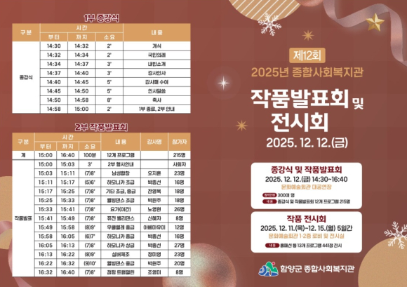 함양군종합사회복지관 작품발표회 및 전시회에 여러분을 초대합니다!12월 12일 12개 프로그램 공연, 12월 11일~15일(5일간) 440여 작품 전시정호 기자 / |