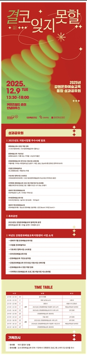 이번 행사는 2025년도 강원문화예술교육 지원사업에 참여한 강원권역 77개 단체 및 기관 관계자 100여 명이 참석했으며, 올 한 해 강원도민의 일상과 삶을 풍요롭게 물들인 문화예술교육의 생생한 성과와 경험을 공유하는 시간을 보냈다.