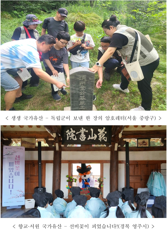| 먼저, ‘생생 국가유산’ 부문에서는 ▲ 망우역사문화공간을 기반으로 독립운동의 의미를 체험 중심으로 잘 전달한 「독립군이 보낸 한 장의 암호테러(서울 중랑구)」, ▲ 전곡선사박물관과의 협업을 통해 프로그램의 깊이를 더한 「너른 고을 광주, 국가유산 생생 체험(경기 광주시)」, ▲ 서악마을의 국가유산을 중심으로 화랑 정신을 체험형 프로그램으로 풀어낸 「화랑이 깃든 서악마을(경북 경주시)」 등 7개 사업이 선정되었다.