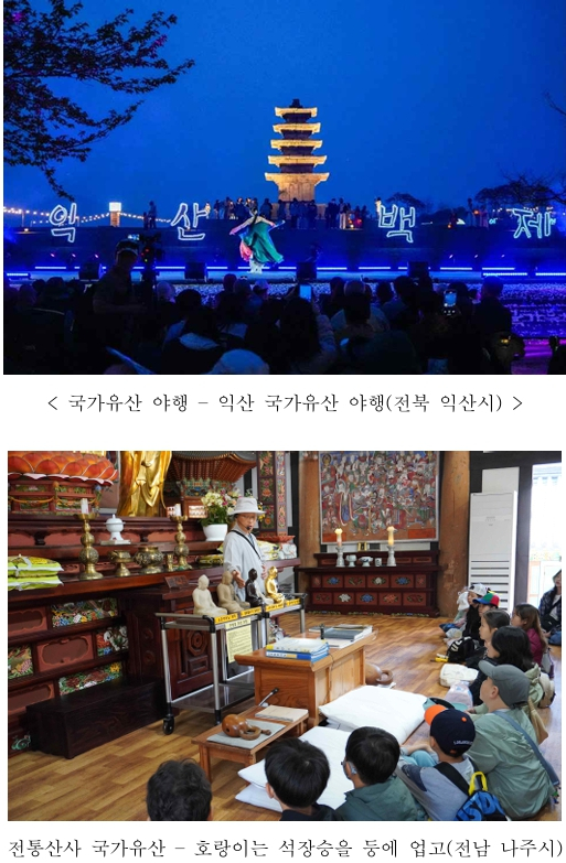 | ‘국가유산 야행’ 부문에서는 ▲ 왕궁리유적을 중심으로 대규모 체험 구역과 다양한 야경 탐방 프로그램을 체계적으로 운영한 「익산 국가유산 야행(전북 익산시)」, ▲ 도시 전체를 잇는 야간 동선을 만들어 군산의 밤을 하나의 문화 흐름으로 완성한 「군산 국가유산 야행(전북 군산시)」, ▲ 화성 성곽길을 따라 걷는 야행과 시민 참여 이동형 거리극, 시장 연계프로그램이 돋보인 「수원 국가유산 야행(경기 수원시)」 등 3개 사업이 선정되었다.