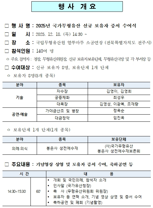 이번 행사는 2025년 새롭게 인정된 국가무형유산 보유자와 보유단체에게 대통령 명의의 증서를 수여하는 자리로, 어려운 여건 속에서 전통문화를 지키고 전승하기 위해 힘써온 보유자와 보유단체를 예우하고 전승자들이 거둔 성취를 축하하기 위해 마련되었다.