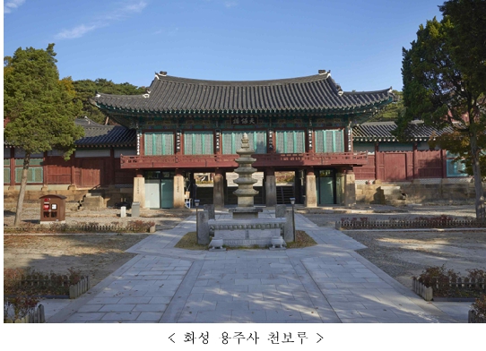 「화성 용주사 천보루」는 대웅전의 중심축에 위치하는 건물로, 정조가 아버지 사도세자의 능침을 양주 배봉산(현 서울 동대문구)에서 수원 화산의 현륭원(顯隆園)으로 옮기고, 명복을 기리기 위해 그 능침사찰로 용주사를 건립하는 과정 속에서 1790년(정조 4년) 건립되어 역사적 가치가 크다.