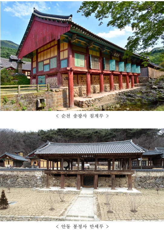 국가유산청(청장 허민)은 「순천 송광사 침계루(順天 松廣寺 枕溪樓)」, 「안동 봉정사 만세루(安東 鳳停寺 萬歲樓)」, 「화성 용주사 천보루(華城 龍珠寺 天保樓)」 3건을 국가지정문화유산 보물로 19일 지정 예고한다.