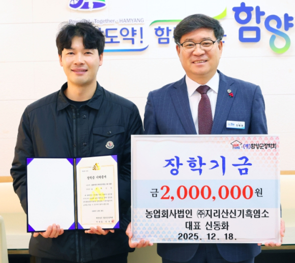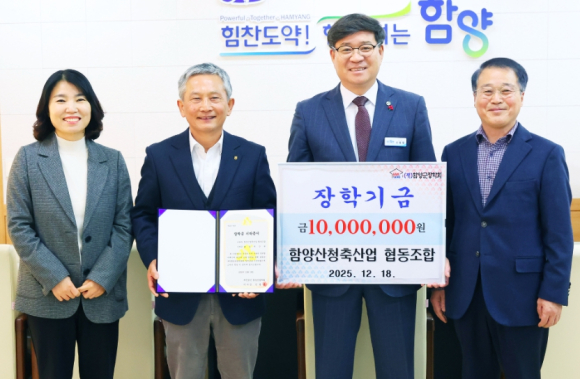 함양 미래세대를 위한 장학금 기탁 매년 이어져함양산청축협 1천만 원·㈜지리산신기흑염소 200만 원·주부모임 100만 원 장학금 기탁정유근 기자 / |