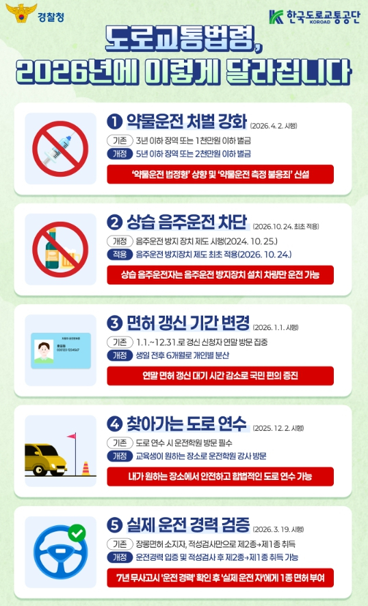 경찰청(청장 직무대행 유재성)은 도로 위 교통안전은 높이고, 국민이 겪는 불편은 줄이는 내용의 도로교통법령을 내년부터 시행한다.