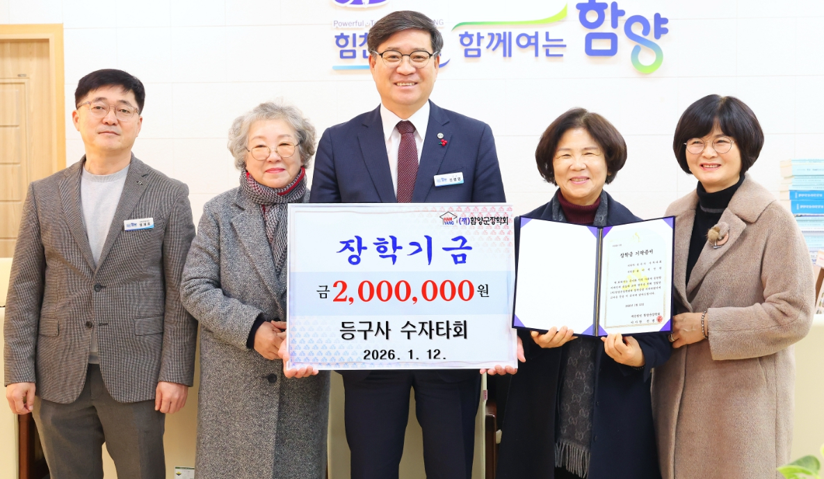 (재)함양군장학회는 1월 12일 마천면 소재 사찰 등구사 신도들의 모임인 수자타회와 함양군 어린이집연합회에서 지역 인재 육성을 위해 장학금을 기탁했다고 밝혔다.