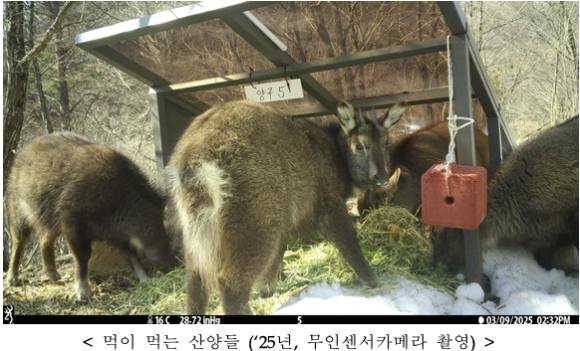 국가유산청은 오는 3월 말까지 양구·화천군에 설치한 먹이급이대와 쉼터에뽕잎, 건초(알파파), 옥수수 등 총 12톤의 먹이를 공급하고, 올해 중으로 쉼터 20개를 추가 설치하는 등 산양 보호 조치를 더욱 확대할 계획이다.