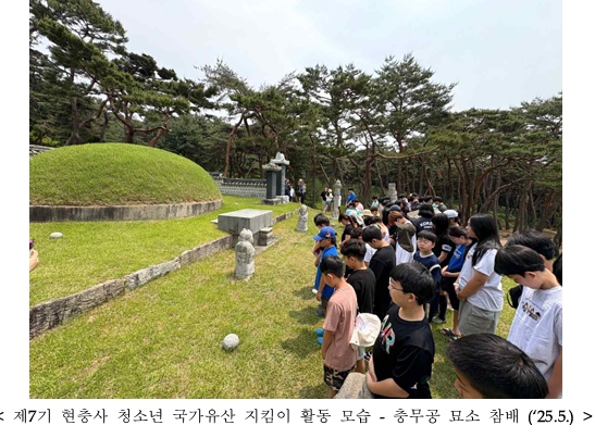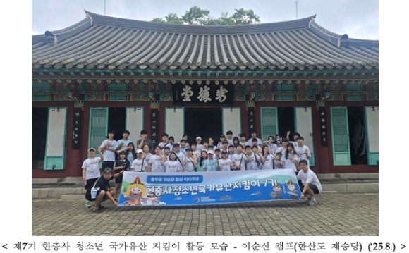 | 앞으로도 국가유산청 현충사관리소는 미래를 이끌어갈 우리 청소년들이 이순신 장군의 애국정신과 아산 현충사의 의미를 깊이 되새기고, 생생한 현장감이 가미된 국가유산 체험 활동을 할 수 있는 기회를 제공하는 적극행정을 실천해 나갈 계획이다. |