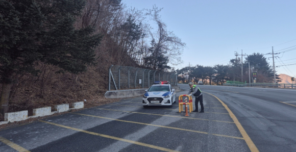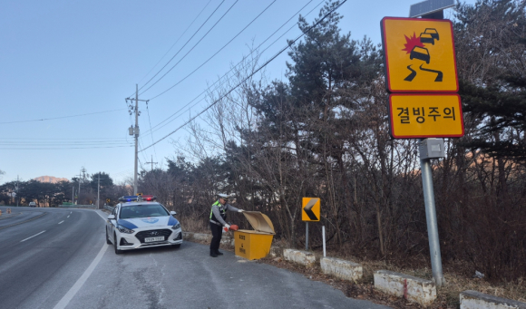 함양경찰서, 기습한파 대설주의보 대비 결빙 취약구간 일제 점검 실시모래주머니, 염화칼슘, 삽 등 비치, 도로통제 대비한 차단시설 작동 여부 등을 일제 점검정유근 기자 / |