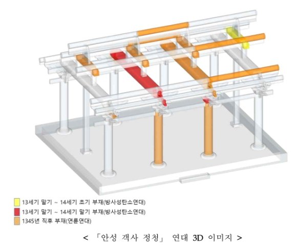 이번 조사를 통해 보물 「안성 객사 정청」 조성에는 1345년 무렵 벌채된 목재가 사용된 것으로 밝혀져 최소 고려 충목왕 5년(1345)경에 건립된 것을 확인할 수 있었다.