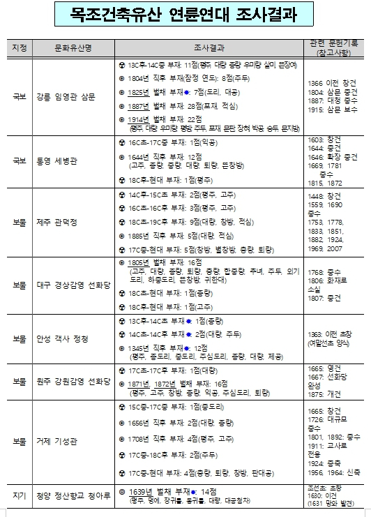 「목조건축유산 연륜연대 및 수종분석 조사」에는 충북대학교 산학협력단, 목재유산연구소, 전통건축수리기술진흥재단이 공동으로 참여하였다. 목조건축유산의 주요 부재별 벌채년도와 수리이력, 수종 등을 과학적으로 조사·분석하여, 고건축 등 관련 학계와 국민에게 다양한 학술·연구자료를 제공하고, 향후 목조건축유산 수리·교체 시 계획 수립과 국가유산 지정(국보, 보물) 등에 적극 활용하고자 추진되었다.