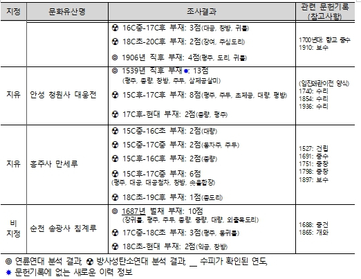 또한, 그동안 국가유산 지정 시 문헌기록과 양식편년기준에 의존하던 목조건축유산의 역사적·학술적 가치를 평가하던 방식에서 나아가, 이번에 실시한 과학적인 연륜연대 분석조사 결과를 같이 활용할 수 있게 되면서 경기도 유형문화유산이었던 「안성 청원사 대웅전」을 국가유산 「보물」로 지정하는 성과도 거둘 수 있었다.
