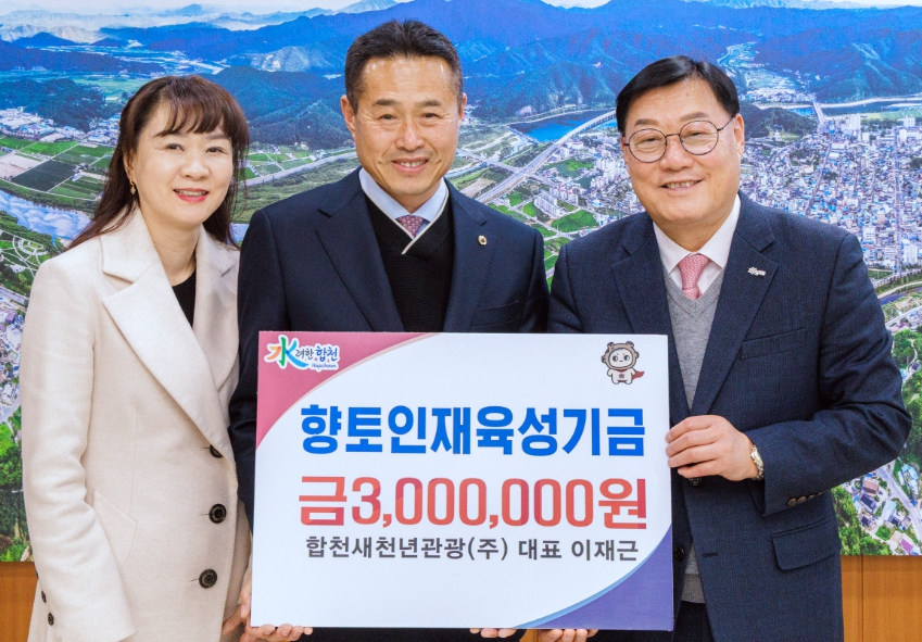 합천새천년관광(주) 이재근 대표는 29일 (재)합천군인재육성재단(이사장 김윤철)을 방문해 지역교육 발전과 미래 인재양성을 위해 써달라며 향토인재육성기금 300만원을 기탁했다.