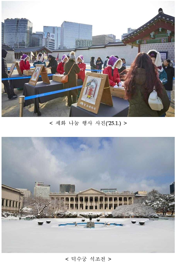 | 국가유산청은 새해 첫 명절을 맞아 많은 국민들이 전국 곳곳에 소재한 국가유산에서 풍성하고 따뜻한 시간을 보내기를 기대하며, 연휴 기간에도 국가유산이 안전하고 체계적으로 보존·관리될 수 있도록 최선을 다할 것이다.