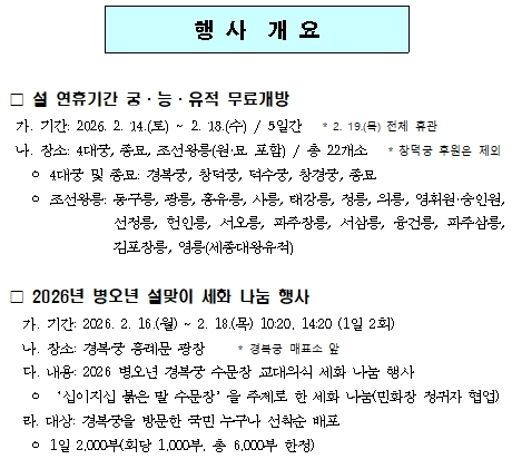 - 4대궁·종묘·조선왕릉 무료 개방(2.14.~2.18. / 22개소)… 종묘는 ‘자유관람’ 전환 - 새해 행운 기원하는 ‘붉은 말 수문장’ 세화 6천부, 경복궁에서 무료 배포(2.16~2.18)
