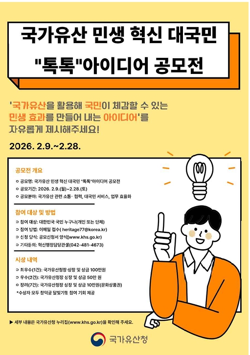 국가유산청(청장 허민)은 2월 9일부터 2월 28일까지 국가유산을 활용해 국민 삶의 질을 높이는 민생형 정책을 발굴하기 위한 「국가유산 민생 혁신 대국민 “톡톡” 아이디어 공모전」을 개최한다.