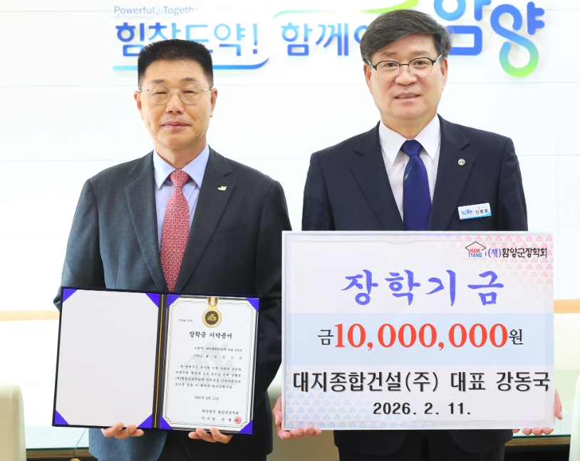 대지종합건설, 함양군 미래 인재 위해 장학금 1,000만 원 기탁어려운 지역 학생들에게 실질적인 도움을 전하고, 미래 인재 양성에 힘을 보태한용택 기자 / |