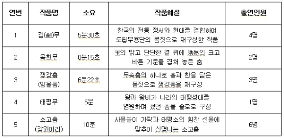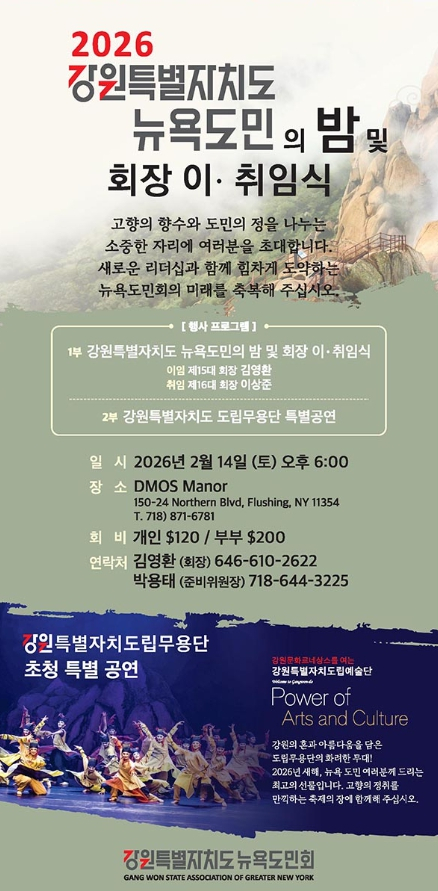 | 공연 프로그램은 ▲검무 ▲옥현무 ▲쟁강춤(방울춤) ▲태평무 ▲소고춤(강원아리) 총 5개 작품으로 구성되었으며, 절제미와 역동성이 어우러진 춤사위를 통해 도민들의 뜨거운 박수를 받았다. 강원특별자치도는 “설 연휴 기간 강원도민과 함께한 이번 공연은 고향의 정을 나누고 문화적 유대를 강화하는 뜻깊은 자리”라며 “앞으로도 다양한 문화교류를 통해 강원 문화예술의 가치를 널리 알리겠다”고 밝혔다. 목 적 뉴욕강원도민회 회장 이취임식 및 ‘강원도민의 밤’행사참여로 해외도민의 유대감·정체성 고취 및 문화적 자긍심 제고