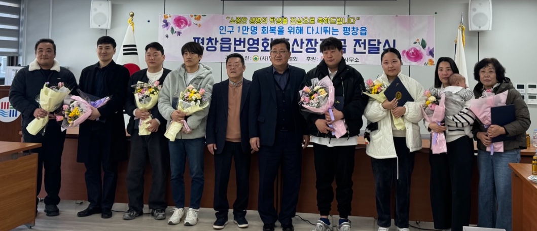 평창군 평창읍 번영회는 2월 20일 오전 11시 평창읍사무소 회의실에서 2025년 4분기 출산 가구 9세대를 대상으로 출산장려금 전달식을 개최했다.