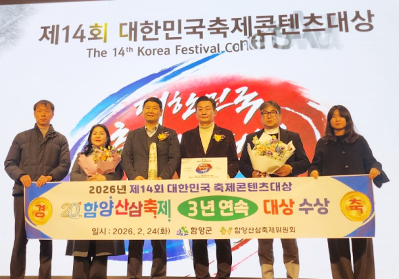 함양산삼축제, 대한민국 축제콘텐츠대상 ‘3년 연속 대상’ 수상지역 특산물 활용·경제 효과 인정받아 산업형 축제로 자리매김정유근 기자 / |