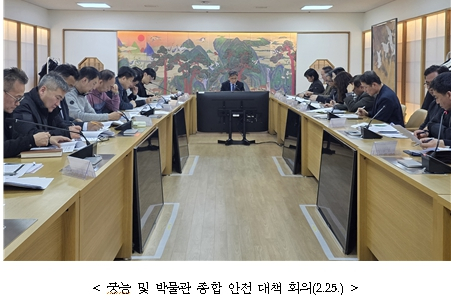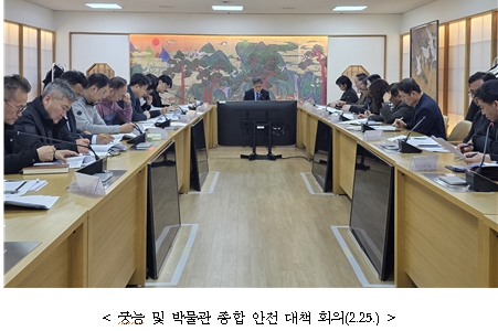 국가유산청(청장 허민)은 2월 25일 국립고궁박물관 고궁회의실 별관(서울 종로구)에서 오는 3월 21(토) 경복궁과 광화문 일원에서 개최 예정인 그룹 방탄소년단(BTS) 공연 관련 안전대책 점검과 최근 4대 궁 및 종묘, 국립 고궁박물관 관람객 증가에 따른 종합 안전 대책 회의를 개최하였다.