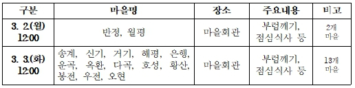 〇 서하면 관내 17개 마을에서는 아래와 같이 정월대보름 맞이 점심식사를 할 예정으로, 주민들이 함께 덕담을 나누고 안녕을 기원하는 뜻깊은 시간이 될 것으로 기대됨.