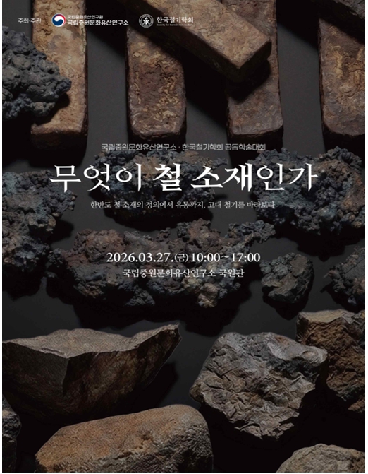 국가유산청 국립문화유산연구원 국립중원문화유산연구소(소장 노명구)는 한국철기학회(회장 이남규)와 함께 2026년 3월 27일(금) 오전 10시 국립중원문화유산연구소 국원관에서『무엇이 철 소재인가?』를 주제로 공동 학술대회를 개최한다.