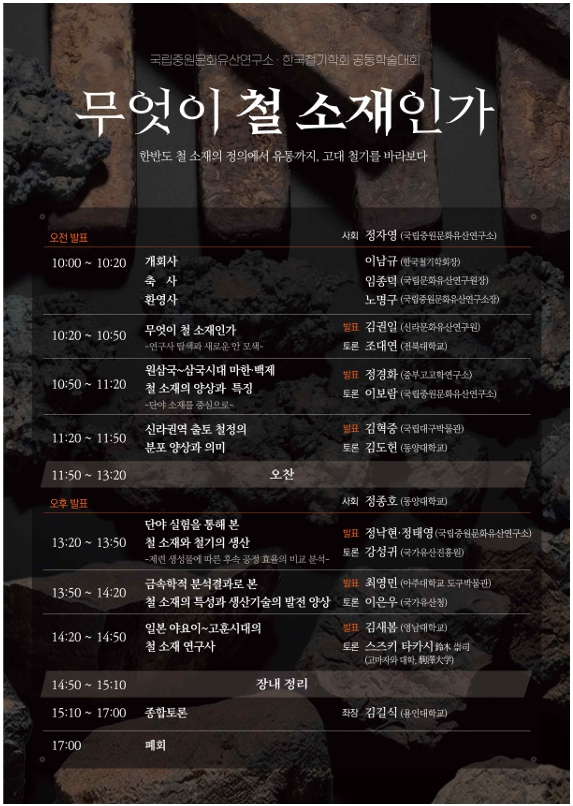 | 오전에는 철 소재의 개념과 지역적 양상을 살펴보는 ▲‘무엇이 철 소재인가?’(김권일, 신라문화유산연구원) ▲‘원삼국~삼국시대 마한·백제 철 소재의 양상과 특징-단야 소재를 중심으로-’(정경화, 중부고고학연구소) ▲‘신라권역 출토 철정의 분포 양상과 의미’(김혁중, 국립대구박물관) 등 3건의 발표가 진행된다.