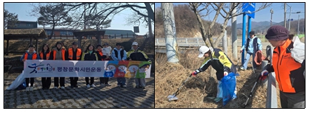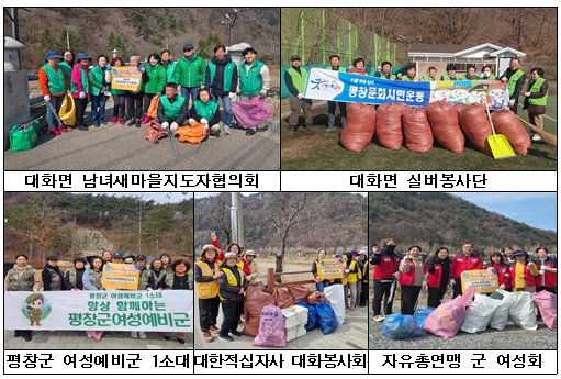 | □ 대화면 사회단체 등, 2026년 자원봉사 릴레이 실시 ੦ 지난(3.21.), 대화면 남녀새마을지도자협의회(회장 육명수, 마영희) 회원 20명의 더위사냥축제장 일원 환경정화 봉사활동을 시작으로대화면 실버봉사단(회장 안금녀) 회원 10명은 대화체육공원에서 낙엽줍기 등 청소활동을 실시하였음. ੦ 또한, 어제(3.22.) 평창군 여성예비군 1소대(소대장 정정희) 소대원 10명은 대화면 광천선굴 일대에서, 면 적십자봉사회(회장 이은경) 및 한국자유총연맹 평창군여성회(회장 김춘애) 회원들은 땀띠공원과 주변 하천변에서 릴레이 환경정화 활동을 실시하였음.