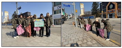 | □ 평창군 여성예비군 2소대, 평창군 자원봉사 릴레이 청결활동 실시 ੦ 지난(3.21.), 평창군 여성예비군 2소대(소대장 신혜경) 소대원 10명은 횡계리 일원 시가지와 도로변에서 환경정화 릴레이 봉사활동을 실시하였음.