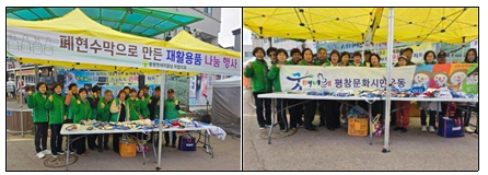 | □ 봉평면 남녀새마을지도자협의회, 탄소중립실천 캠페인 실시 ੦ 어제(3.22.), 봉평면 남녀새마을지도자협의회(회장 김철형, 김영숙) 회원 25명은 봉평전통시장 일원에서 굿매너 평창 문화시민운동의 일환으로 폐현수막을 활용한 앞치마 등을 배부하며 탄소중립 실천을 위한 캠페인을 진행하였음.