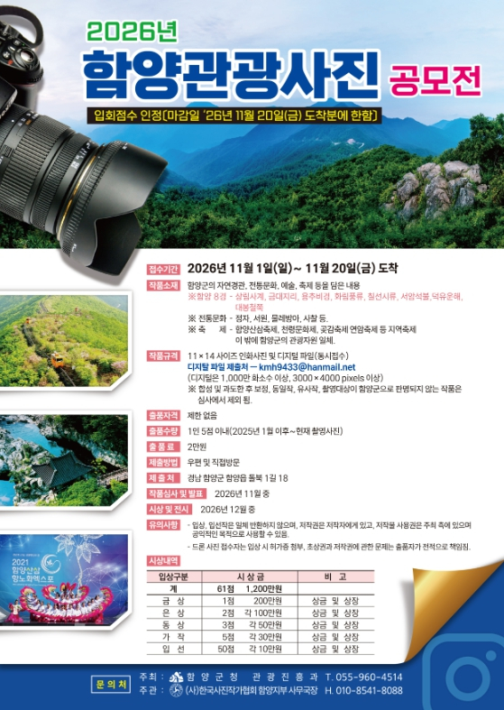 함양군, ‘2026 함양관광 전국사진 공모전’ 개최총상금 1,200만 원 규모…11월 1일부터 20일까지 접수한용택 기자 / |