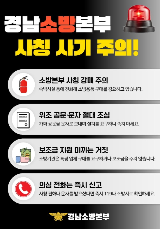 | 또 정부 지원금이나 보조금을 받을 수 있다고 안내하며 선입금을 요구한 뒤 연락을 끊는 사례도 있어 주의가 필요하다. 최근에는 소방기관 명의를 도용한 공문이나 명함을 활용하고, 소방관을 사칭해 문자메시지나 전자우편으로 접근하는 등 수법이 점점 지능화되고 있다. 소방서는 ▲공문에 특정 업체나 제품 구매를 명시하는 경우 ▲연락처가 010 등 개인 휴대전화 번호인 경우 ▲보조금 지급 등을 이유로 결제를 재촉하는 경우에는 사기 가능성을 의심해야 한다고 강조했다. 아울러 “소방기관은 특정 업체의 물품 구매를 알선하거나 금전을 요구하는 일이 없다”며, 의심스러운 연락이나 공문을 받을 경우 즉시 거래를 중단하고 반드시 관할 소방서에 사실 여부를 확인할 것을 당부했다. 박해성 소방서장은 “소방기관을 사칭한 범죄는 군민의 신뢰를 악용한 중대한 범죄”라며 “금전 요구나 물품 구매를 강요받을 경우 절대 응하지 말고 소방서에 확인해 피해를 예방해 주시길 바란다”고 말했다.